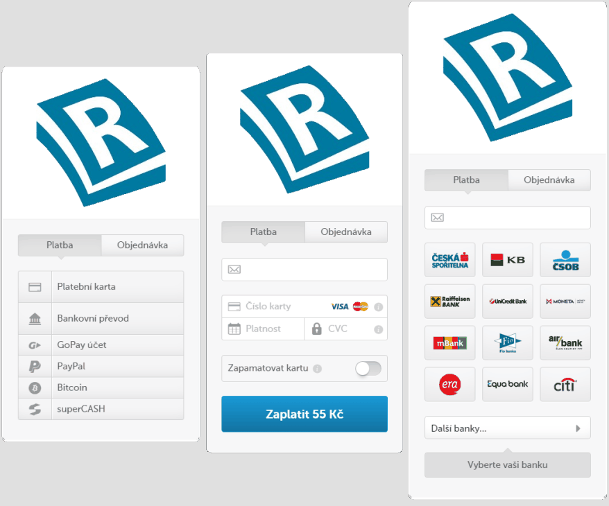 Po dokončení objednávky budete automaticky přesměrování na platební portál, kde se můžete zvolit jednu z mnoha nabízených možností platby (PLATBA KARTOU, BANKOVNÍM PŘEVODEM ONLINE, a mnoho dalších). Jednoduše vyplňte všechny údaje / přihlašte se do Vašeho bankovnictví a platbu odešlete. Obratem Vám GoPay a náš server vystaví potvrzení o přijetí a zaplacení objednávky.